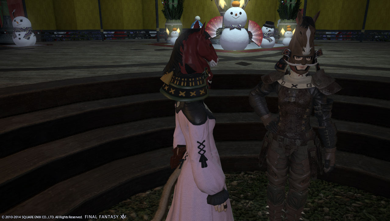 午形兜を被り赤馬同心と話したにゃ
